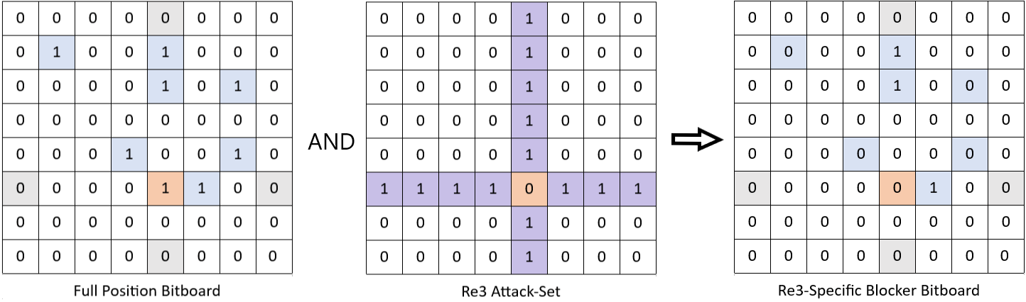 - Iterates through orthogonal directions to calculate potential target squares. Sets corresponding bits in the moves bitboard for valid and unoccupied target squares.